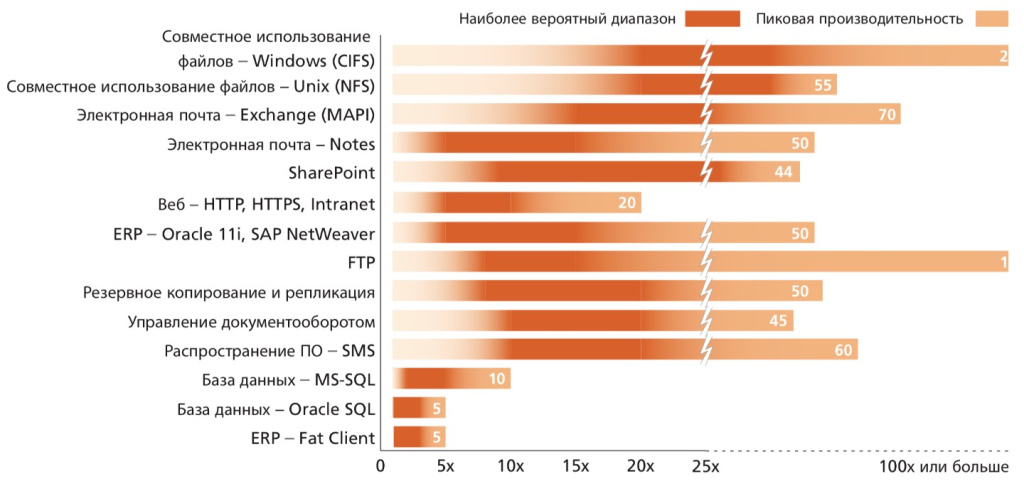 При помощи системы RiOS повышается производительность всех ключевых приложений предприятия по сети WAN, а во многих случаях результат сравним с работой в сети LAN. На следующей диаграмме указан ожидаемый уровень ускорения работы некоторых из наиболее популярных приложений, используемых нашими клиентами: